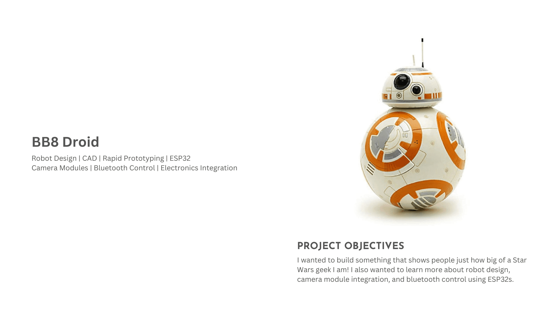 Since I’m a big Star Wars geek, I’m currently building a BB8 Droid that can be controlled using a joystick via bluetooth. The droid will also be displaying a live camera feed, which will allow it to be controlled remotely.