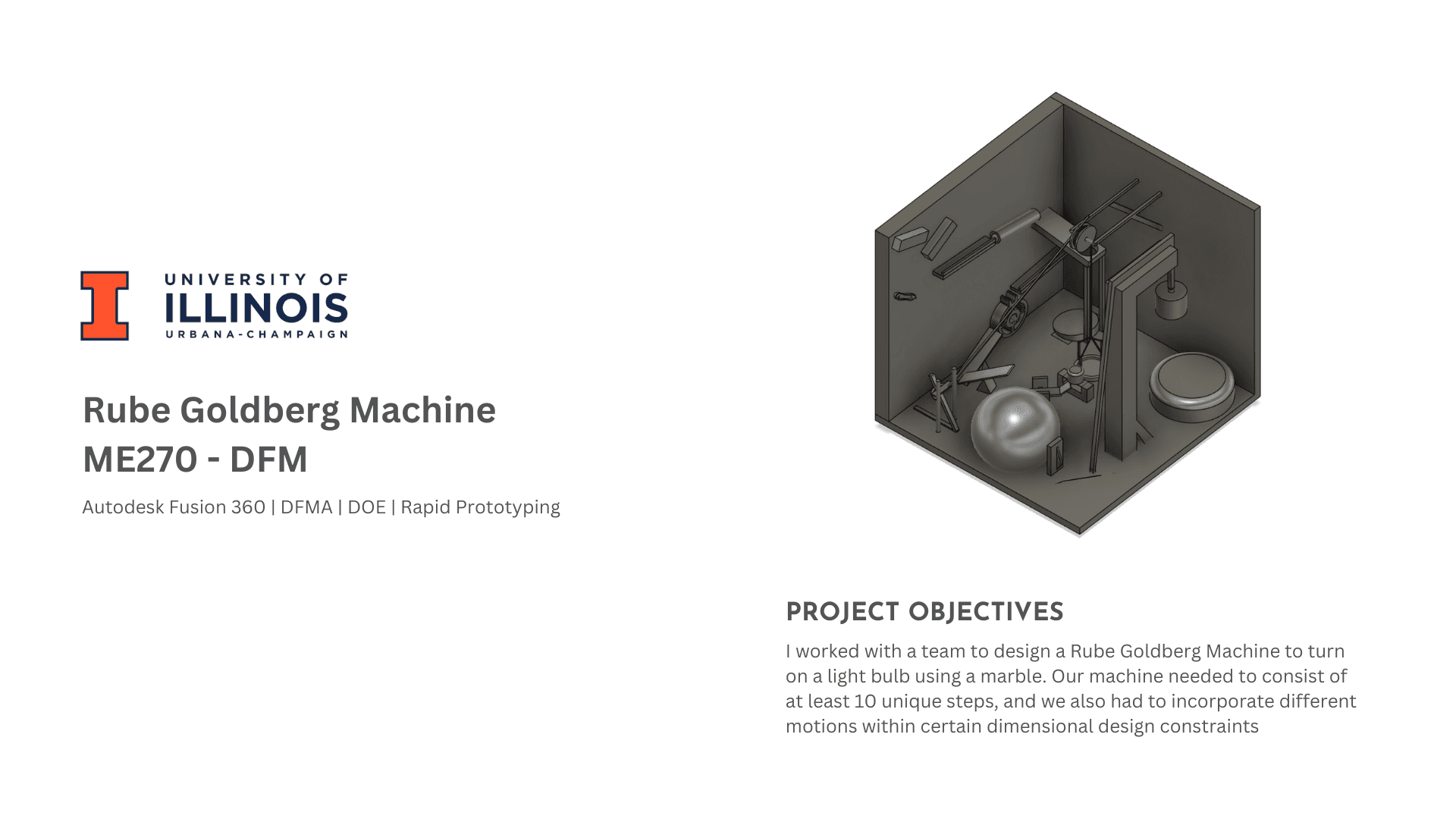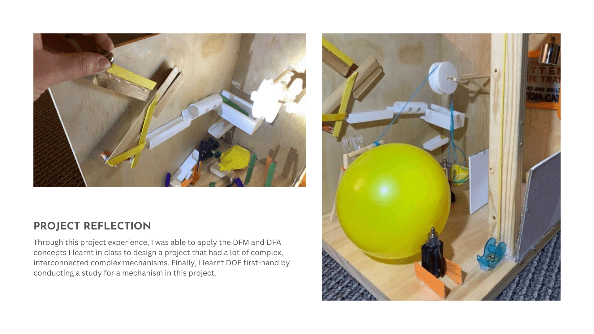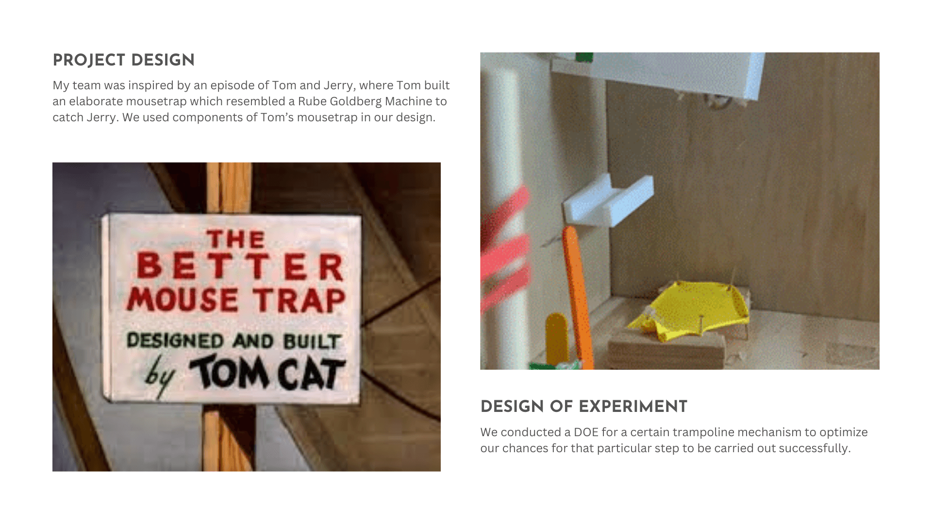 I worked with a team to design a Rube Goldberg machine to turn on a light bulb. I took inspiration from the Better Mouse Trap design that Tom built to trap Jerry!