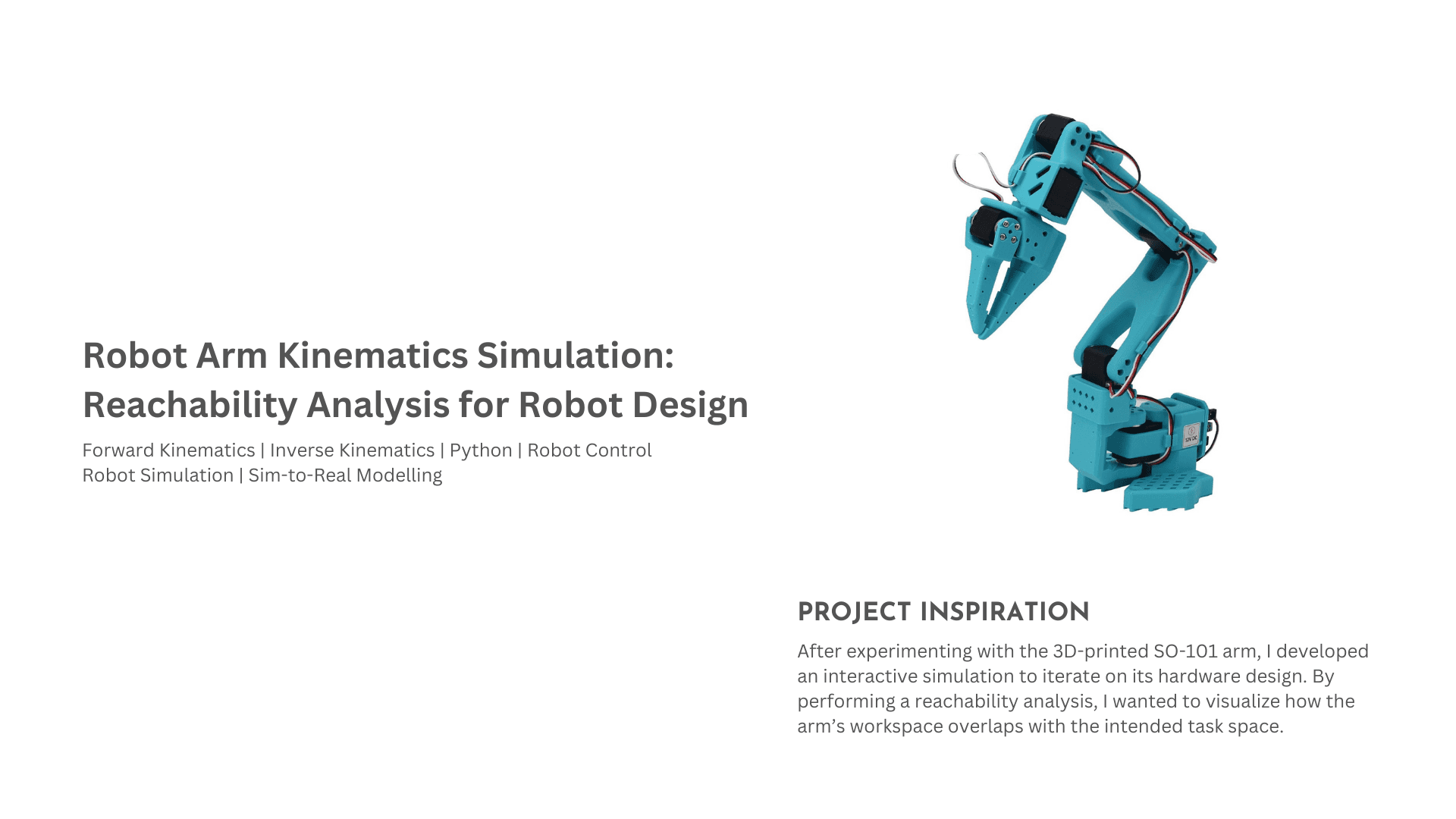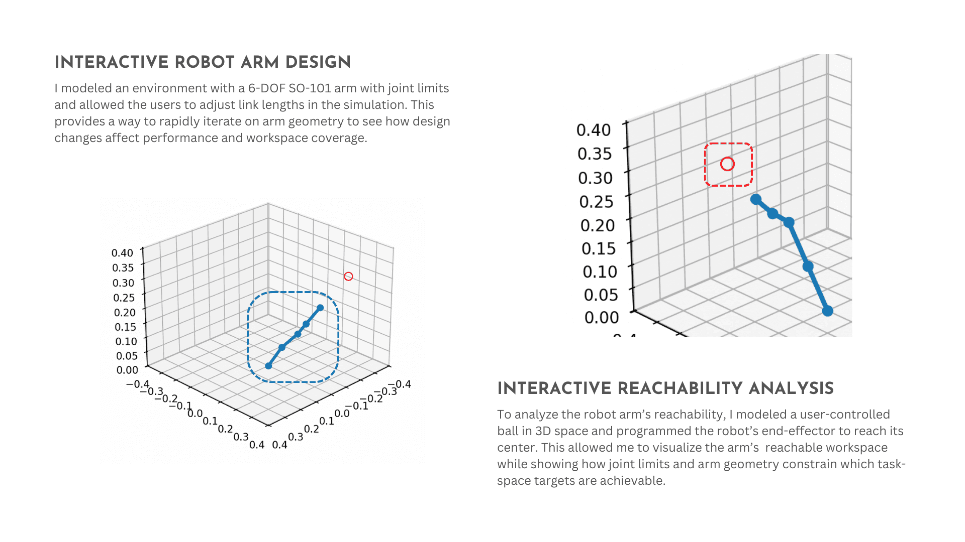After my experience working with the SO-101 arm for the LeRobot Hackathon, I wanted to build something that would help me iterate on the robot design a lot faster before fabrication. At the same time, I wanted to learn more about robot kinematics and robot control, and how it can help influence robot design, which led me to build this kinematics simulator.